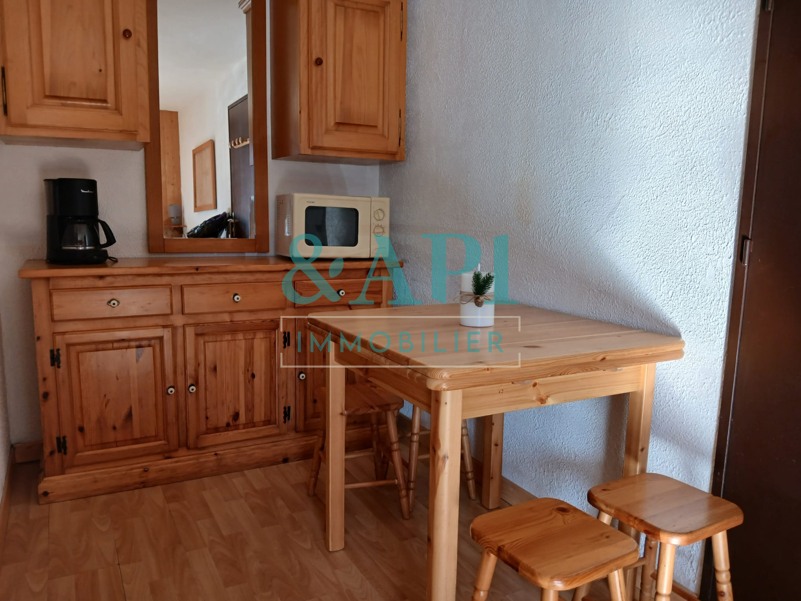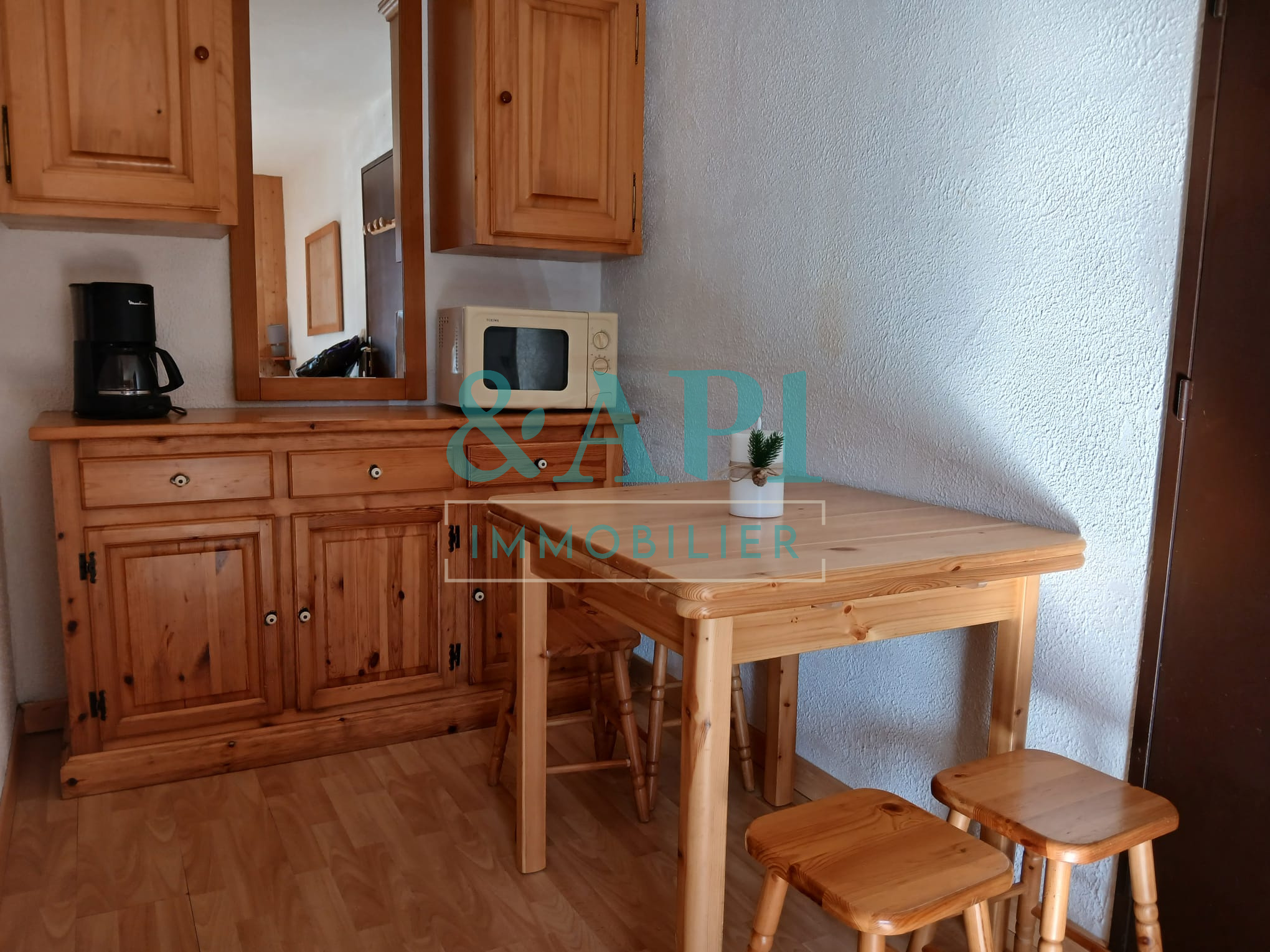 Il se compose d’un séjour avec canapé convertible, d’une chambre équipé d’un lit superposé (2x1place) avec rangement et placards, d’une cuisine équipée, d’une salle de bains, d’un WC et d’un balcon offrant une très belle vue dégagée sur la montagne. L’appartement est entièrement équipé : plaque électrique, micro-ondes, réfrigérateur, aspirateur, télévision et place de parking nominative.